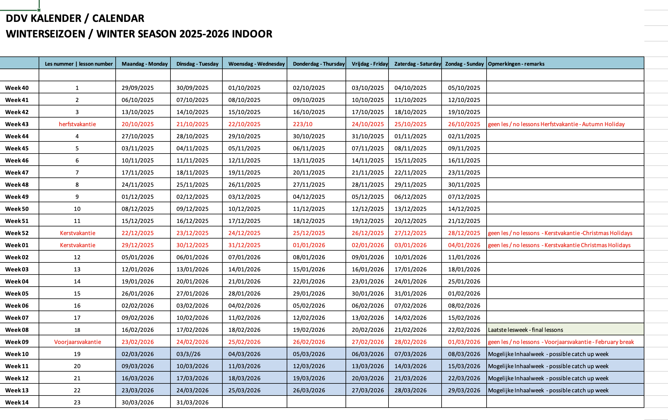Hier vind je een kalender met daarin de lesweken, vakanties en vrije dagen (onder voorbehoud van wijzigingen) en het lesreglement/algemene voorwaarden krijg je zodra je inschrijft. Let op, bij alle outdoor cursussen van 15 weken heb je een garantie van 12 lessen en voor de outdoor cursussen van 10 weken heb je een garantie van 7 lessen in verband met eventueel slechte weersomstandigheden en de conditie van de baan.